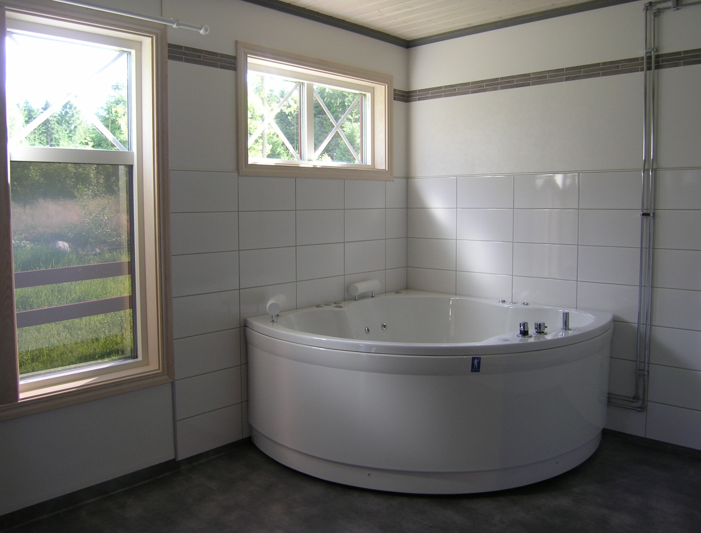 • kaklat badrum med bubbelbadkar, tvättmaskin/torktumlare och en bastu